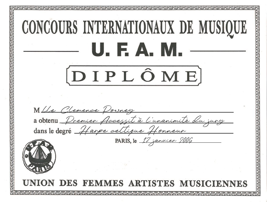 J’ai débuté la harpe classique à pédales à 15 ans, mais j’ai continué à participer chaque année, de mes 9 à mes 19 ans, aux concours internationaux de harpe celtique de l’UFAM à Paris, remportant chaque fois une médaille (1er, 2e ou 3e prix). J’ai terminé au niveau le plus élevé, Honneur, où j’ai obtenu un 1er Accessit en 2007.