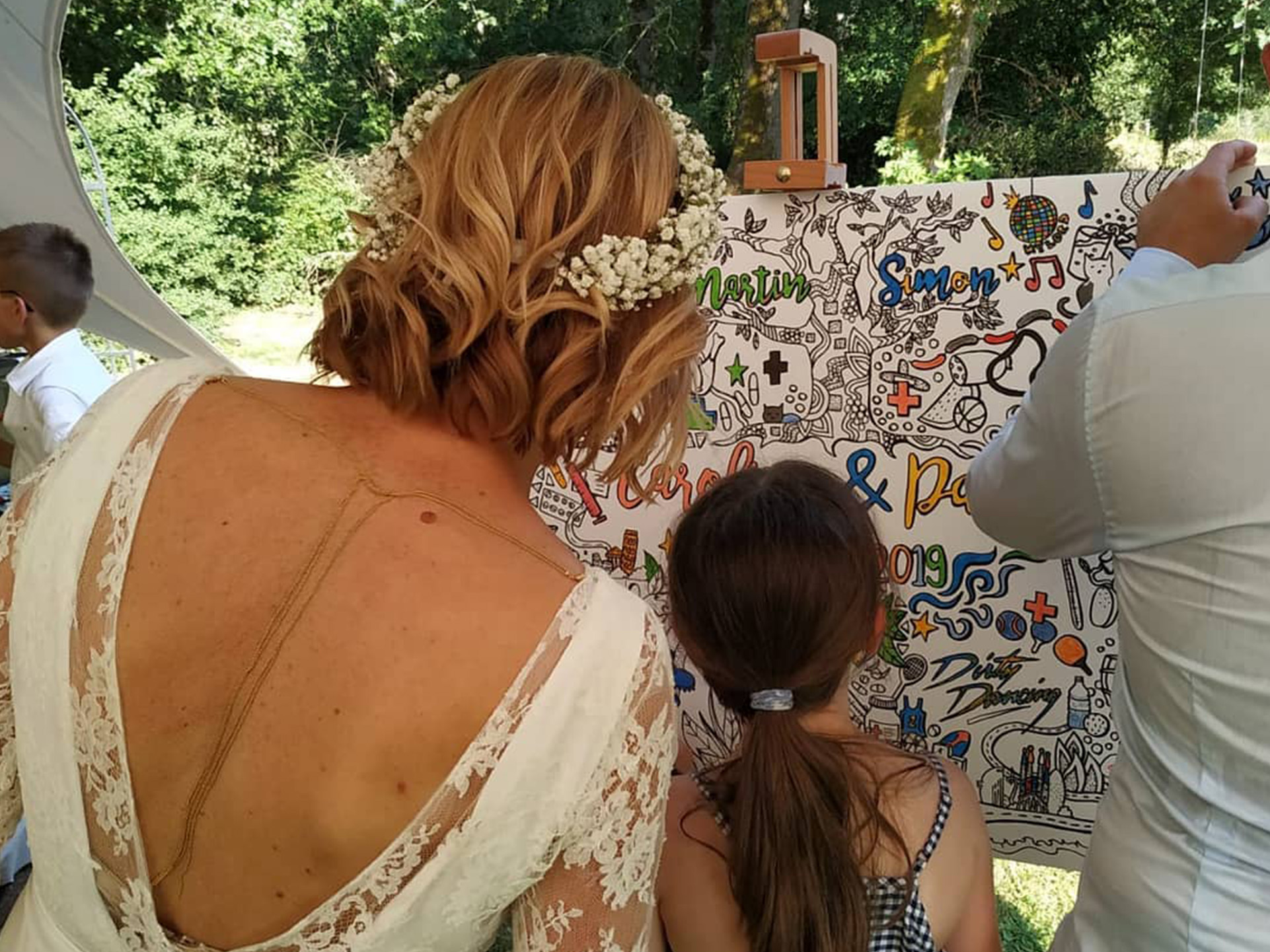 La fresque participative est une façon amusante et interactive d’impliquer vos invités pendant votre mariage. Je crée l’oeuvre au marker noir avant l’événement et les invités sont encouragés à les mettre en couleur. L’œuvre finale est un souvenir joyeux et personnalisé de votre célébration !