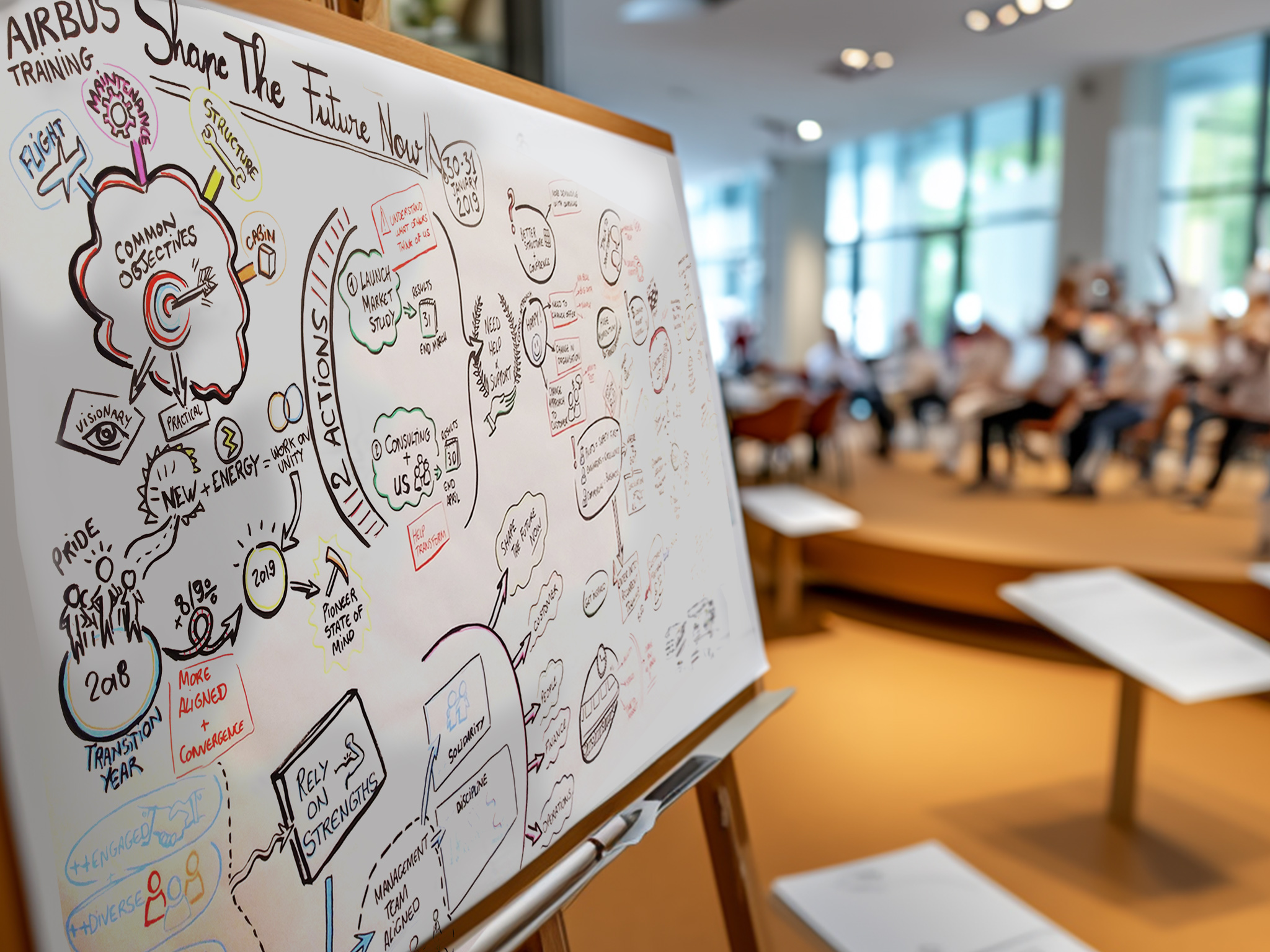 La facilitation graphique est l’art de transformer des idées en images pour rendre les échanges plus clairs, vivants et mémorables. En direct lors d’ateliers, de conférences ou d’événements, je capte l’essentiel des discussions et le traduis en schémas visuels, mots-clés et illustrations. Ce support visuel stimule l’attention, favorise la compréhension collective et crée une trace tangible et créative qui prolonge l’impact de vos rencontres.